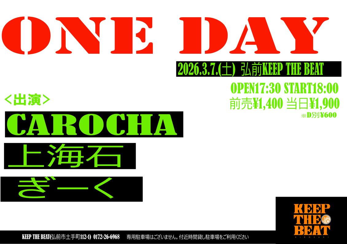 「ONE DAY」 出演:CAROCHA /上海石/ぎーく OPEN17:30 START18:00 前売1400円 当日1900円 ※ドリンク別途600円 チケット:各バンド予約/KTB Date 2026 / 03/ 07 Category LIVE PICK UP