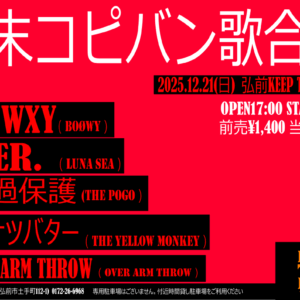 年末コピバン歌合戦 ピーナツバター(THE YELOW MONKEY) THE過保護(THE POGO) 3DER. (LUNA SEA) UNDER ARM THROW(OVER ARM THROW) BOOWXY(BOOWY) open17:00 ... 21 12月 17:00