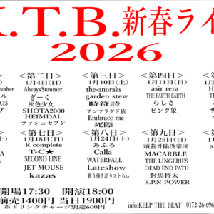 KTB新春LIVE2026~第三日~ the-anoraks garden stew 時符詩 アンプラグド猿 Embrace me 死際 開場17:30 開演18:00 前売1400円 当日1900円 ※ドリンクチャージ別途600円 チケット:各出演者予約/KTB ... 10 1月