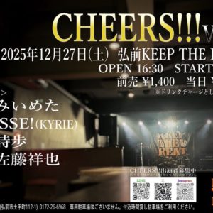 CHEERS!!! vol.5 みいめた iSSE!(KYRIE) 詩歩 佐藤祥也 OPEN16:30 START17:00 前売¥1400 当日¥1900 ※ドリンクチャージとして別途¥600 ... 27 12月 17:00
